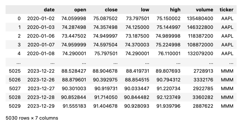 I got three years of trading data from Yahoo Finance (2020 – 2023) for stocks (tickers) Apple, Microsoft, Amazon, Google, and 3M, which I downloaded using yfinance (https://pypi.org/project/yfinance/) library in Python.
