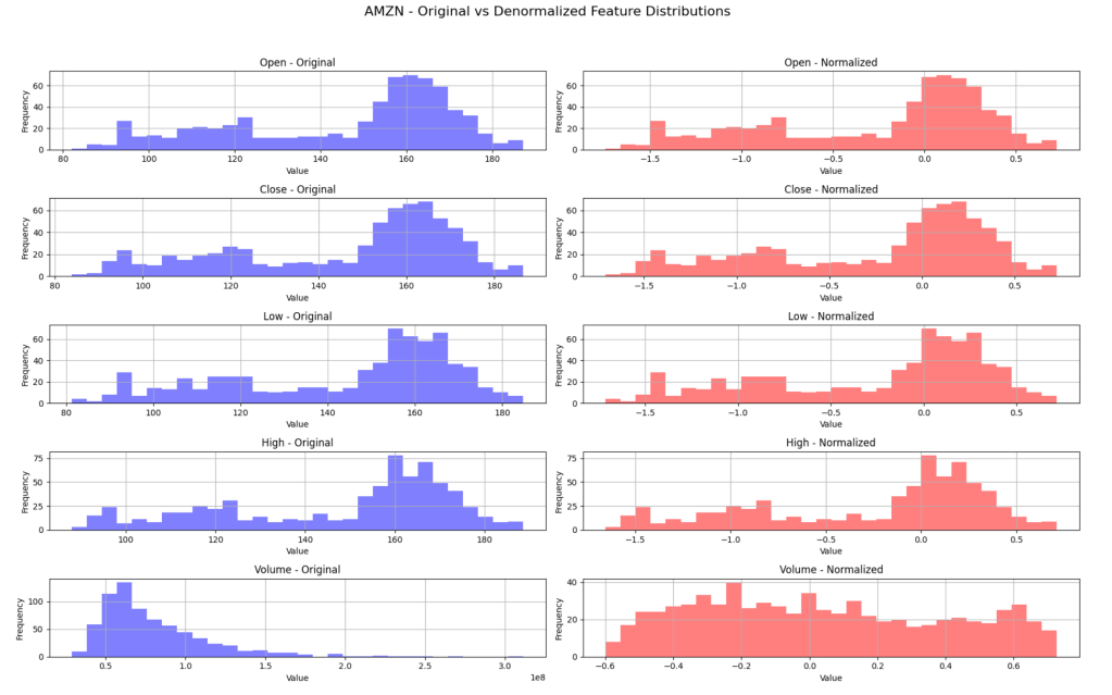 Let’s have a look at the Amazon ticker example of how original vs. normalized data looks. Each ticker is normalized independently to account for varying price/volume scales across instruments.