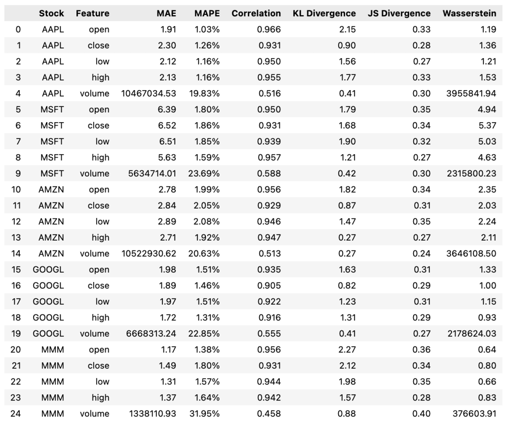 Each metric captures different aspects – correlation shows relationship strength, MAPE shows prediction accuracy and distribution metrics ensure realistic data generation patterns. Using multiple metrics provides a comprehensive evaluation and guards against metric-specific biases.